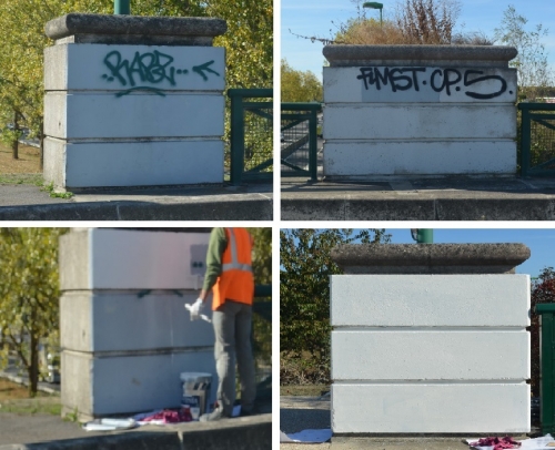 Ainsi ce samedi 13 octobre, une liaison douce va être inaugurée, donnant accès à Saint Quentin depuis le rond point de la N12. Il se trouve que toutes les piles du pont donnant accès à ce rond-point étaient couvertes de graffitis…jusqu’à aujourd’hui, lundi 8 octobre. Comme on peut le voir sur les photos ci-dessous, prises à quelques minutes d’intervalle, un employé communal a recouvert tous ces vilains graffitis…C’est d’ailleurs étonnant, voire anormal, qu’un employé municipal intervienne sur un pont qui n’appartient pas à la Ville.